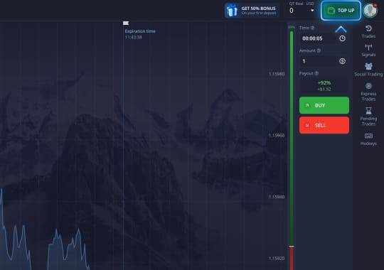 Ensuite, vous vous retrouverez dans la situation actuelle du marché de l'actif choisi. En outre, ajoutez les indicateurs nécessaires au graphique, activez les signaux et les dessins pour faciliter l'analyse technique du marché. Faites vos prévisions et passez l'ordre en utilisant le panneau de trading. Vous pouvez toujours suivre et surveiller votre séance de trading dans le menu Trades.